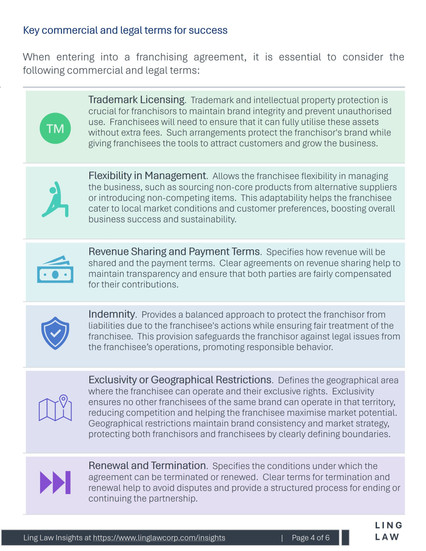 Having a good adviser can help structure rights and responsibilities equitably, fostering long-term, win-win relationships and ensuring both parties achieve their goals. Understanding and navigating the legal landscape is crucial for both franchisors and franchisees. Legal guidance can provide clarity on contract terms, protect intellectual property, and ensure compliance with local regulations. For franchisors, this means securing their brand and business model, while clearly defining the support and expectations for franchisees. For franchisees, it ensures they understand their obligations and rights, helping them operate within legal frameworks and avoid potential pitfalls. Ultimately, informed legal advice contributes to a stable and prosperous franchise relationship, benefiting all parties involved.